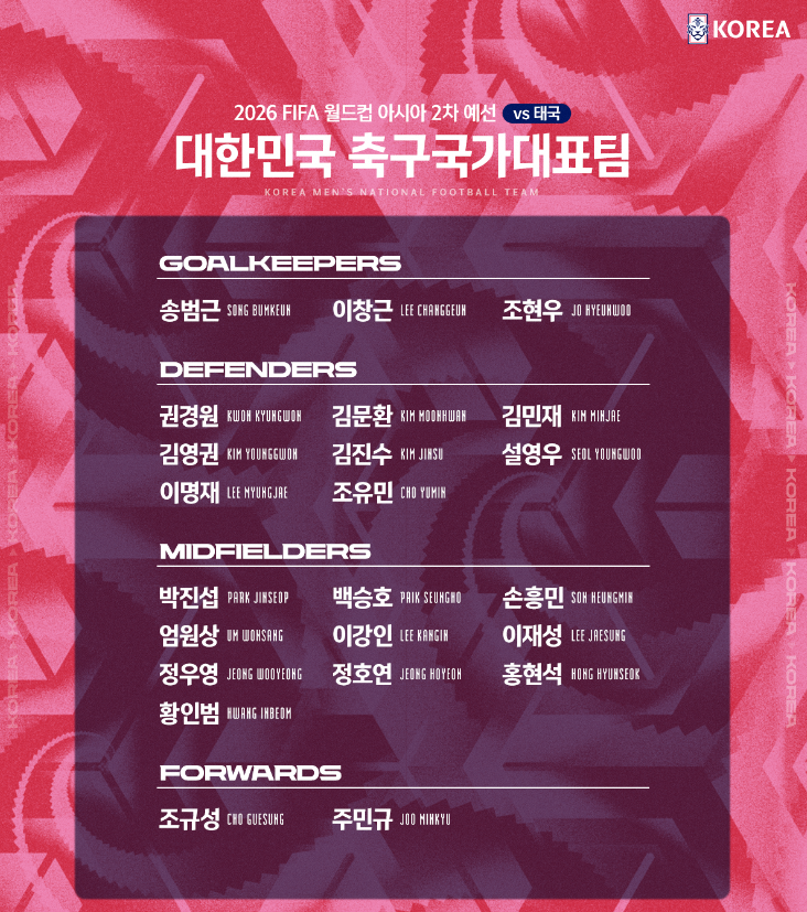 대한민국 VS 태국전 국가대표팀 명단은 다음과 같습니다.