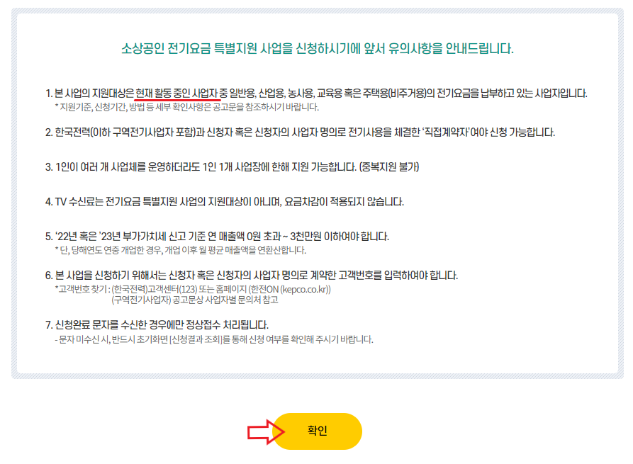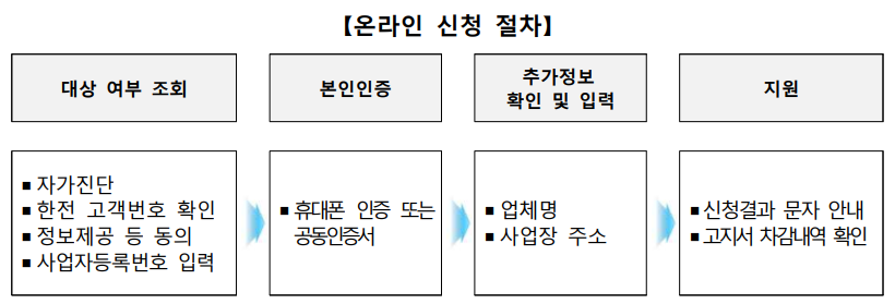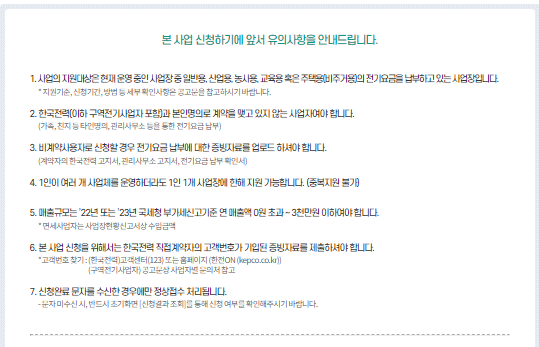 - 신청자명(대표자명), 사업자등록번호, 사업장 주소지, 사업장에 적용되는 전기요금 고객번호 등