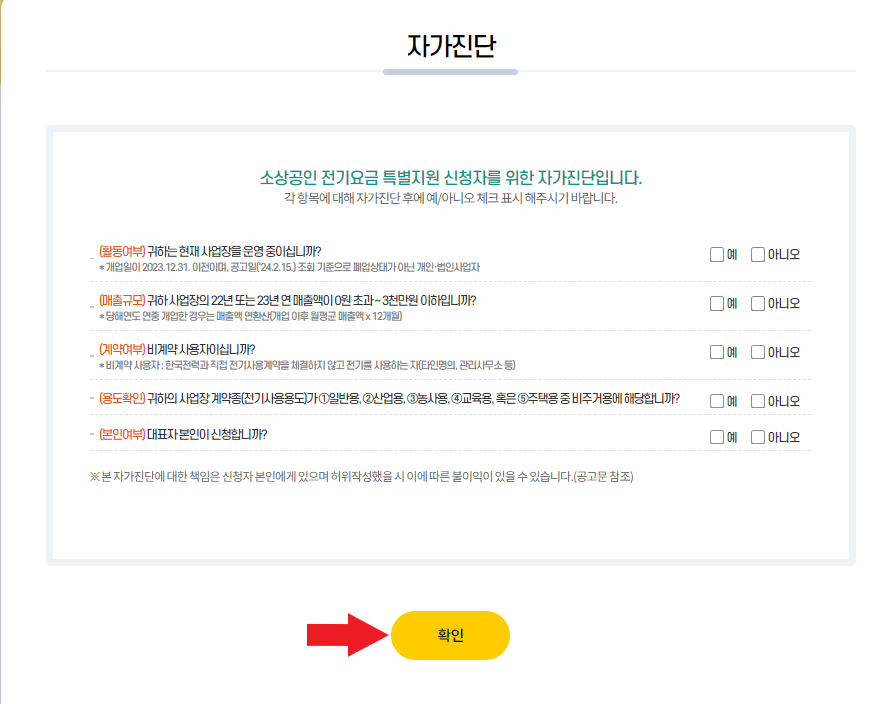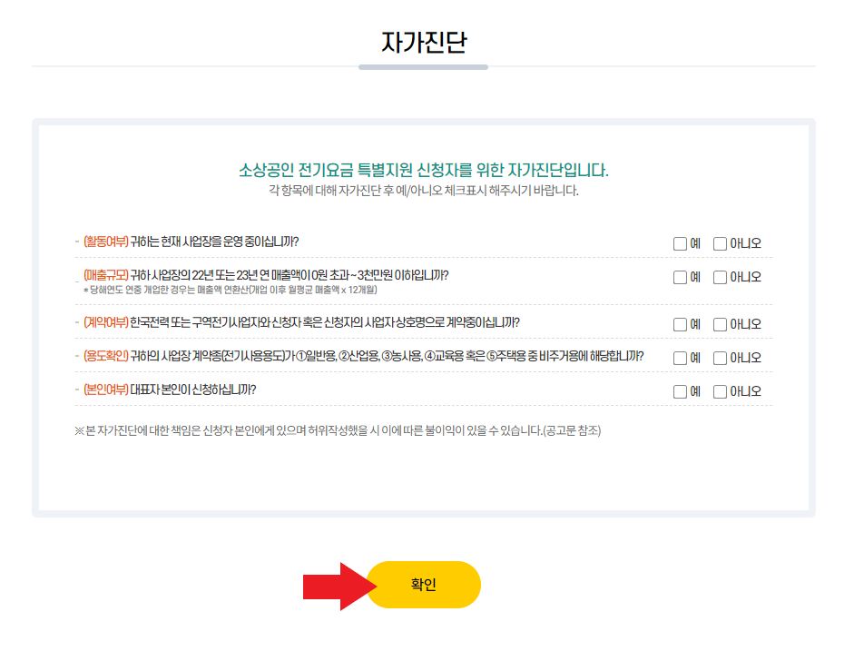 소상공인 전기요금 특별지원금을 신청하기 전 유의사항을 자세히 검토해 보시고 확인을 누르시면 아래와 같이 자가진단 표가 나타납니다.