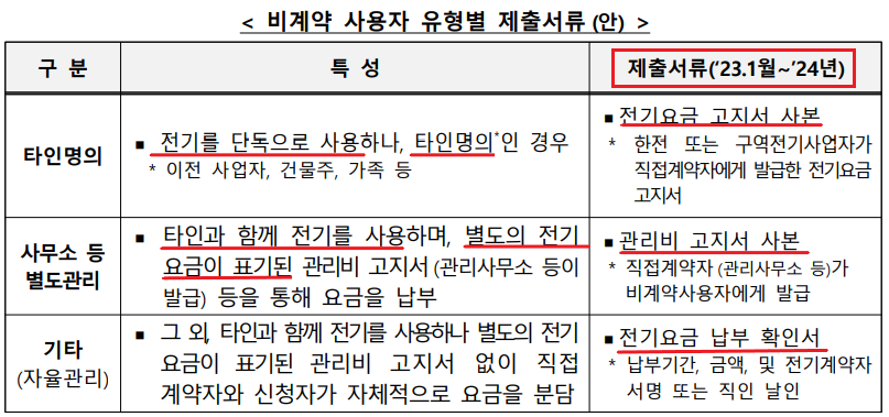 제출서류 및 지원방식은 전기 사용 유형별 두 가지로 직접 계약자와 비계약 사용자로 나누어집니다.