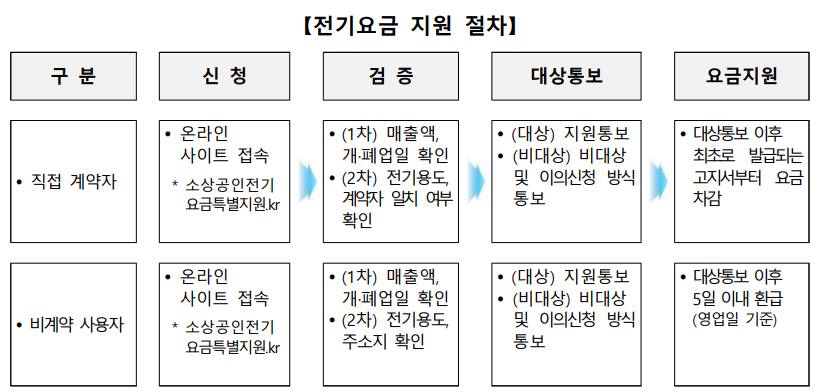 전기요금의 지원 절차는 신청 ▶ 검증 ▶ 대상통보 ▶ 요금지원의 순서로 진행됩니다. 검증이 완료된 후 대상인지 비대상인지를 통보하고 이의신청을 할 수 있는 방식 또한 통보합니다.