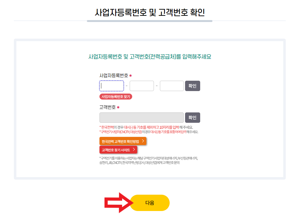 ▷ 신청자가 입력한 고객번호와 한전 고객번호 매칭 후, 동일인 여부를 검증하고 공동대표자가 있는 경우, 한전과 직접 계약한 공동대표자가 신청하여야 함을 유의하시기 바랍니다.