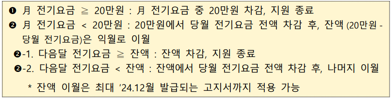 ▷ 대상자 통보 후 최초로 발행되는 '24년 전기요금고지서 상 청구되는 전기요금부터 최대 20만 원 차감합니다. 전기요금 고지서 발행일 등에 따라 최초 발행된 고지서 이후 다음 달 고지서부터 요금 차감이 적용될 수 있으니 참고하시기 바랍니다.
