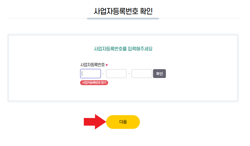 자가진단을 모두 마치고 확인 버튼을 누르시면, 사업자 등록번호 입력 창이 뜹니다. 이러한 순서로 신청을 하실 수 있습니다.